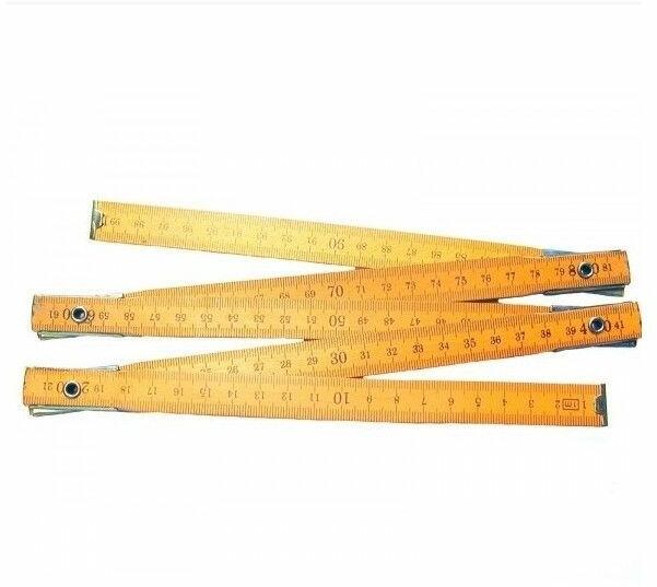 Összehajtható hosszúságmérő tárgyak mérésére. 2 m hosszúságig. Anyaga bükkfa, rézbevonatú rugós illesztésekkel. Class III osztály, sárga/fehér lakkozott felület.